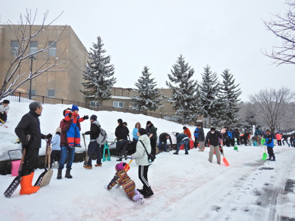 当日は、旭山動物園職員の指示のもと、参加者が持参したスノースコップやスノーダンプを使用し、ペンギンの散歩道へ雪を追加する作業を行いました。朝の冷え込みにより雪が固く締まっていたため、まず雪を砕く作業から始め、その後ペンギンが歩きやすいよう表面を丁寧に均していきました。親子で協力しながら作業に取り組む姿も多く見られ、会場は終始和やかな雰囲気に包まれていました。